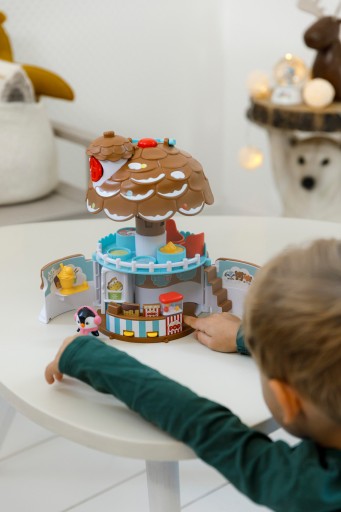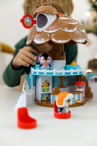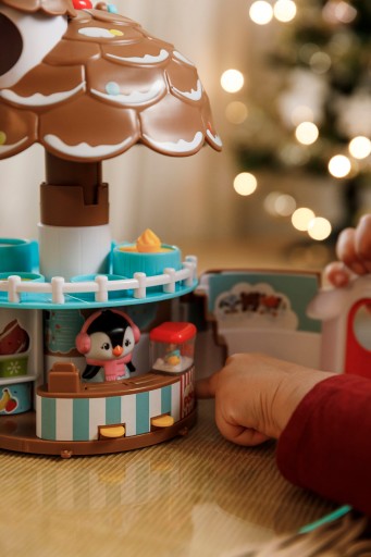 Naciśnij przycisk na szczycie dachu, aby lodziarnia się otworzyła. Domek ma dwa piętra i okno na dachu, w którym można postawić zwierzątko. Na piętrze lodziarni są dwa stoliki i fotele dla gości. Stoliki mają obrotowy blat, na których są różne rzeczy. Na parterze lodziarni jest blat z kasą i maszyną do popcornu. Po naciśnięciu guziczka popcorn będzie skakać w maszynie. Z blatu wyskakują gorf z czekoladą i opakowanie z popcornem po naciśnięciu przycisków. Obróć wałeczek aby wybrać smak lodów. A potem podaj lody gościom.