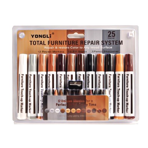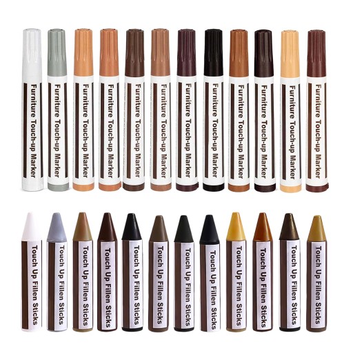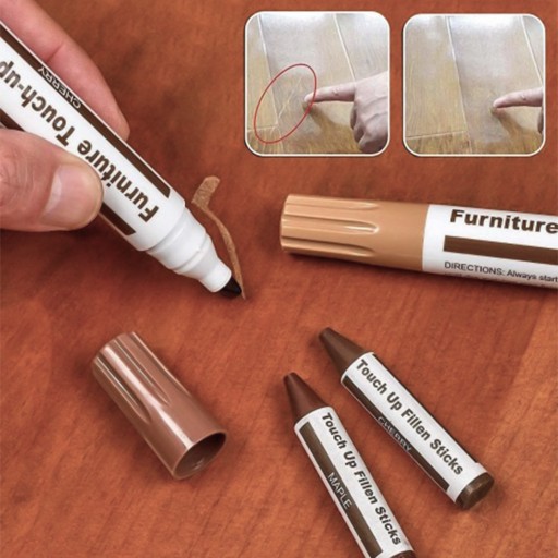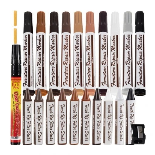 Zestaw markerów i półtwardych wosków do samodzielnej naprawy mebli drewnianych, podłóg, paneli, schodów, futryn i wielu innych. Zestaw pozwala zniwelować niewielkie odpryski na elementach mebli i podłóg nienarażonych na znaczną eksploatację.