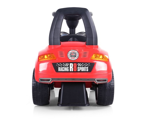 Sportowe autko może posłużyć dziecku jako pierwszy pojazd do jeżdżenia z prawdziwą kierownicą i klaksonem, jak również pchacz z otwieranym schowkiem na zabawki (mały bagażnik).