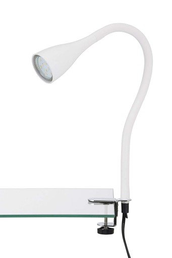 Lampka stołowa - biurkowa z miękkim ramieniem, mocowana do blatu za pomocą zacisku. Lampka w odróżnieniu od tradycyjnej stojącej lampy biurkowej nie zajmuje przestrzeni potrzebnej do pracy a spełnia tą samą funkcję, a dzięki miękkiej "szyi" światło możemy ustawić w każdym kierunku. Dodatkowo lampka wyposażona jest w żarówkę z wbudowanym 3 stopniowym ściemniaczem a sterowanie odbywa się za pomocą włącznika na kablu.