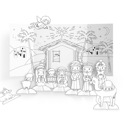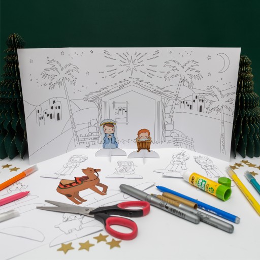 Wspólnie wytnijcie i pokolorujcie charakterystyczne postaci Świętej Rodziny, Trzech Króli, anioła i zwierzątek, a następnie ustawcie je na tle własnoręcznie udekorowanej flamastrami stajenki.