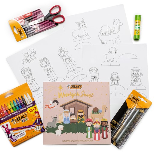 Świąteczny zestaw plastyczny BIC - kredki, flamastry, kleje + szopka bożonarodzeniowa