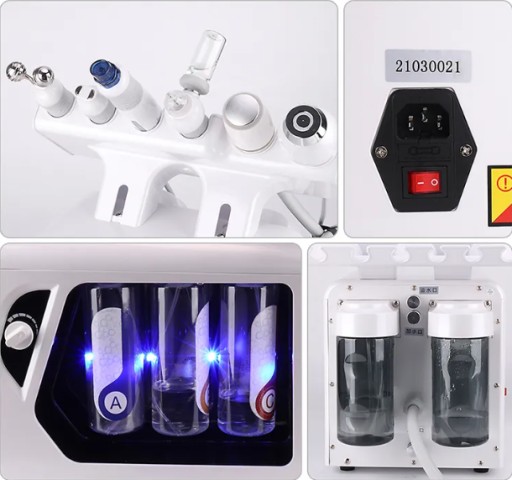 Ten sprzęt łączy technologie RF, EMS, mikroprąd, wtłaczanie tlenu, tlenowo-wodorowe czyszczenie gorącymi bańkami, jak również gorący i zimny młotek, aby osiągnąć doskonałe efekty ujędrniania skóry, podnoszenia, czyszczenia wybielania i nawilżania, usuwania zmarszczek i usuwania ciemnych kręgów itp.