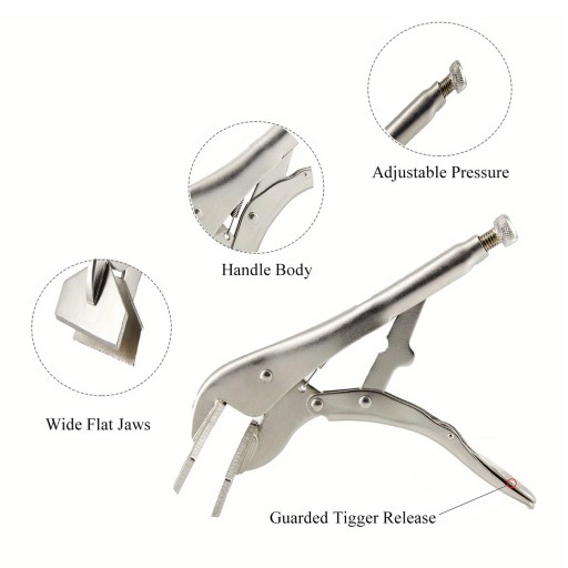 [Humanizowany projekt]: Szczypce spawalnicze z płaską główką, mogą mocno chwycić blachę. Konstrukcja dźwigni szybkiego zwalniania zapewnia maksymalną siłę blokowania i trwałość.
