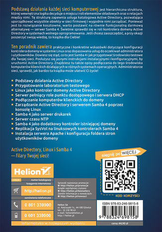 Podstawą działania każdej sieci komputerowej jest hierarchiczna struktura, której wewnętrzna logika decyduje o miejscu i roli elementów składowych oraz o relacjach między nimi. Tę strukturę zapewnia usługa katalogowa Active Directory, pozwalająca uporządkować wszystkie obiekty w sieci firmowej i wygodnie nimi zarządzać. Ponieważ jest to rozwiązanie kosztowne, warto postawić na równie funkcjonalną darmową alternatywę -- serwer Samba 4. Świetnie sprawdzi się w roli kontrolera domeny Active Directory w systemach wolnego oprogramowania. Jeśli chcesz zaoszczędzić, a przy okazji poszerzyć swoją wiedzę, to książka dla Ciebie!Ten poradnik zawiera praktyczne i konkretne wskazówki dotyczące konfiguracji kontrolera domeny w systemie Linux oraz dopasowania usług do oczekiwań administratora i użytkowników. Dowiesz się stąd, co to jest Samba 4 i jak przygotować środowisko testowe dla Twojej sieci. Posłużysz się jasnymi instrukcjami instalacyjnymi i konfiguracyjnymi, by uruchomić Active Directory. Znajdziesz tu także opisy podłączania do tego środowiska komputerów klienckich działających w różnych systemach operacyjnych. Administratorze sieci, sprawdź, jak bardzo ta książka może ułatwić Ci życie!