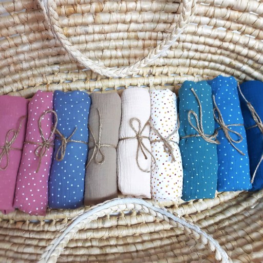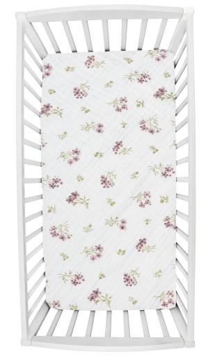 Prześcieradło z gumką na materac do łóżeczka zostało wykonane ze 100% bawełny muślinowej.