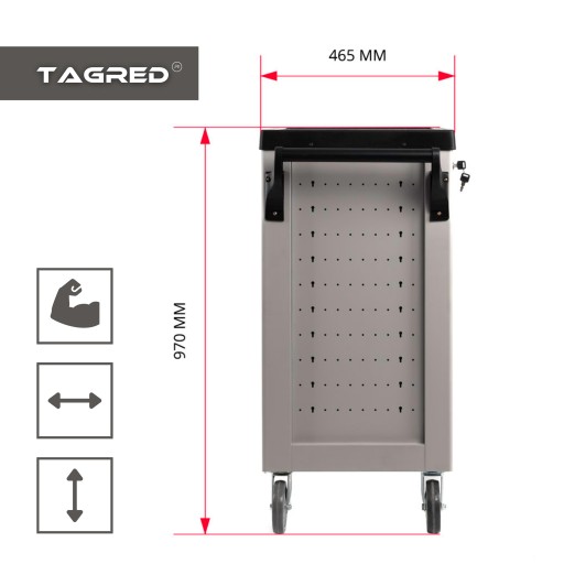 ✅Zwiększona szerokość szafki TAGRED oraz duże gumowane koła sprawiają, że wózek narzędziowy przestawiamy bez obaw o przewrócenie, daje nam to poczucie pewności.