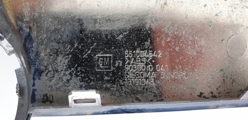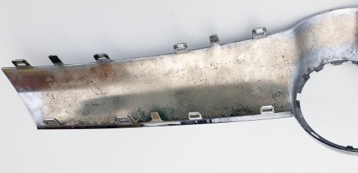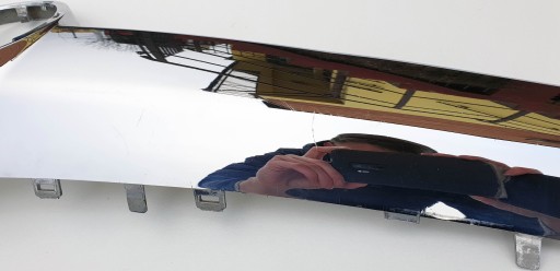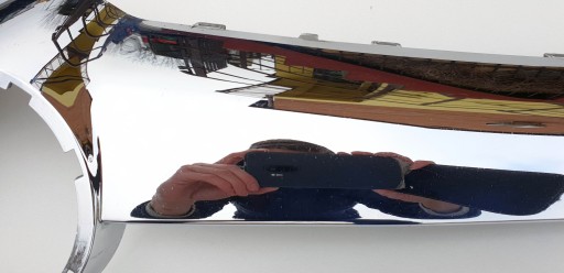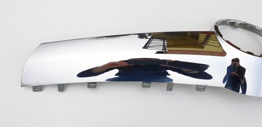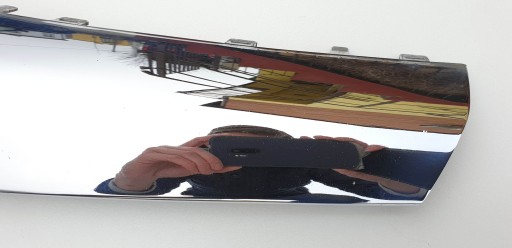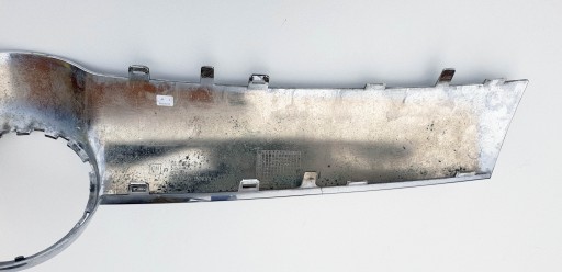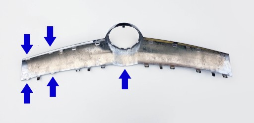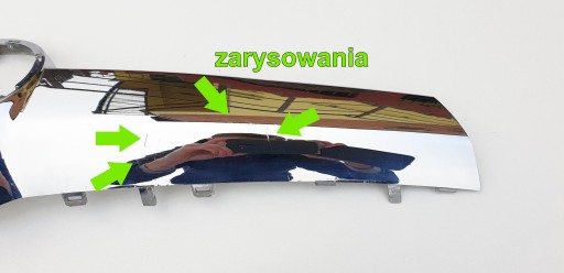 Wizualnie jak widać nie jest źle, ale do ideału daleko. Chrom ogólnie ładny, jak widać jest lusterko. Nie puchnie, nie matowieje, nie zauważyłem żeby gdzieś odchodził. Jest jeden znaczący defekt, a mianowicie pęknięcie w dolnej części po lewej stronie (zaznaczone czerwonymi strzałkami). Poza tym, będąc mocno pedantycznym, zaznaczyłem kilka zarysowań (na jednym zdjęciu zaznaczone zielonymi strzałkami). Z mocowań brakuje 4 sztuk (zaznaczone na zdjęciu niebieskimi strzałkami). Wypraska oryginalna co potwierdza widoczne na jednym zdjęciu logo GM wraz z numerami.