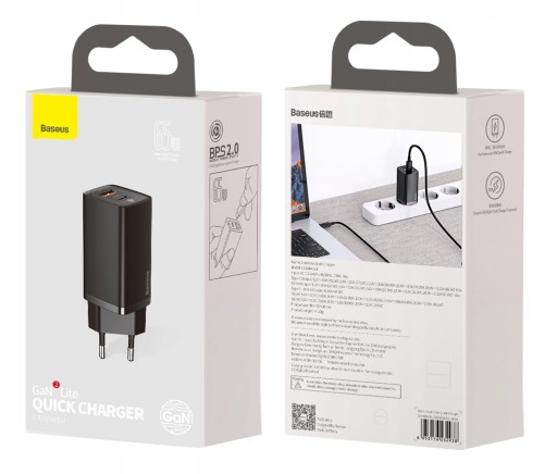 Producent Baseus Model CCGAN2L-B01 Wymiary 85.2 x 30.5 x 92 mm Napięcie wejściowe AC 100-240V, 50/60Hz, 2.5A Max Napięcie wyjściowe
