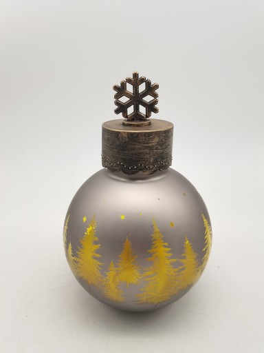 Bombka w kolorze szarym ze złotymi choinkami które podświetlone wyglądają rewelacyjnie.