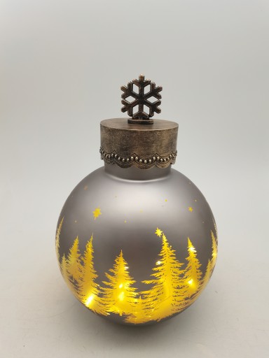 Bombka w kolorze szarym ze złotymi choinkami które podświetlone wyglądają rewelacyjnie.
