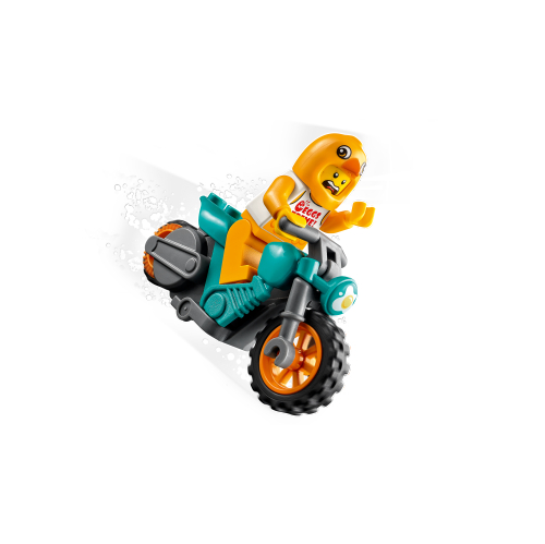 - Zestaw LEGO® City Motocykl kaskaderski z kurczakiem zawiera fajny motocykl kaskaderski napędzany kołem zamachowym do robienia niezwykłych sztuczek, a także minifigurkę z serialu telewizyjnego LEGO City Adventures.