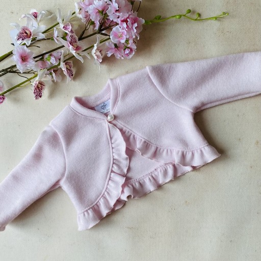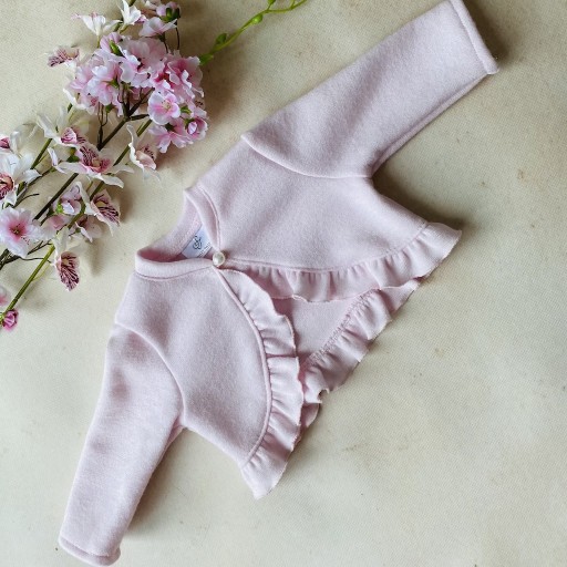 Bolerko w kolorze jasnego różu świetnie sprawdzi się podczas chrztu, wesela czy innego rodzinnego święta. Wygląda niezwykle uroczo i dziewczęco, a spora zawartość włókien wełny zapewni ciepło podczas uroczystości np. w kościele. Bolerko uszyte jest z przyjemnej w dotyku cieniutkiej dzianiny, skrojone z półkola i zaprojektowane tak by nie zasłaniało sukieneczki i dodatków. Bolerko wykończone jest uroczą falbanką i zapinane na perełkę pod szyją. Dedykowane do naszych białych sukienek!