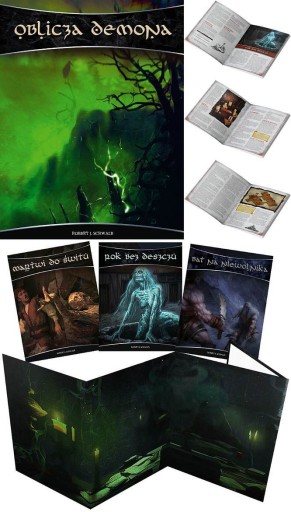 "Oblicza Demona" zostały ufundowane przez wspaniałą społeczność kultystów Władcy Demonów i zawierają ekran mistrza gry oraz książeczkę z przygodami.