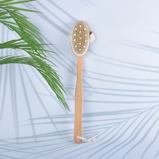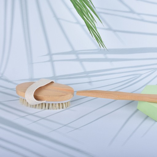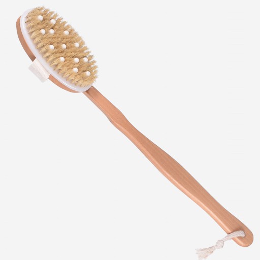 Włosie szczotki wykonane jest z wysokiej jakości naturalnego materiału, który delikatnie masuje skórę, pobudza krążenie krwi i stymuluje limfatyczny system odprowadzania toksyn.