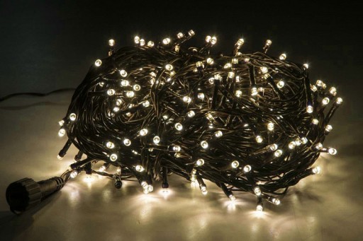 Lampki 400 LED z PROGRAMATOREM (8 funkcji sterowania), PILOTEM, DODATKOWYM GNIAZDEM (możliwość łączenia kompletów) oraz TIMEREM włącznikiem/wyłącznikiem czasowym na ciemno zielonym przewodzie.