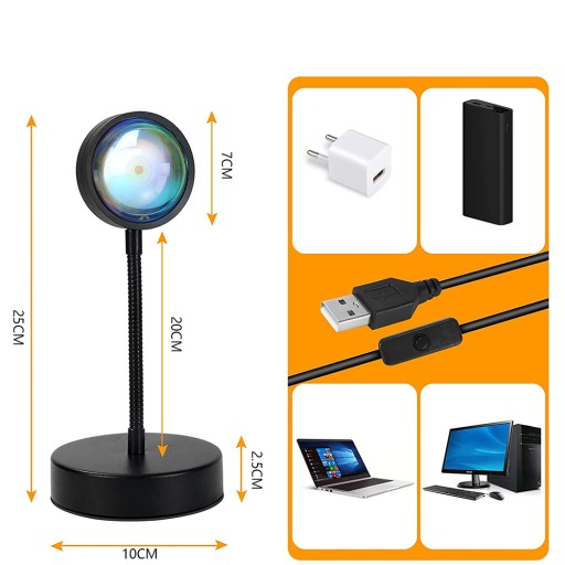 - Projektor zachodu słońca zasilany jest przez USB i wyposażony w światło LED o mocy 10W,