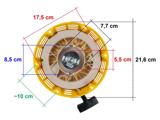 Przedmiotem oferty jest szarpak marki Toolbox dedykowany do większości agregatów, motopomp, zagęszczarek, odśnieżarek oraz innych urządzeń dostępnych na rynku, wykorzystujących silnik benzynowy. Starter można montować go przy użyciu 3 lub 6 śrub, dzięki czemu pasuje do większej gamy urządzeń.