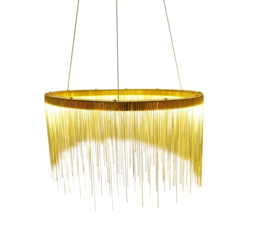 Wyjątkowa, kaskadowa Lampa Wisząca LED o mocy 72W z setkami złotych łańcuszków.