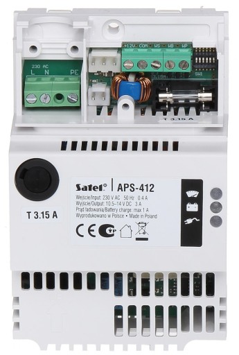 Zasilacz buforowy jest przeznaczony do zasilania central alarmowych, czujników, zamków szyfrowych, kamer, manipulatorów, domofonów i innych urządzeń wchodzących w skład systemu alarmowego. APS-412 posiada dedykowane złącze pozwalające na wspólpracę z urządzeniami firmy Satel.