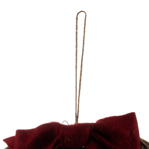 Oferowany przez nas wieniec powstał z gałązek. Ponadto został bogato ozdobiony rozmaitymi dekoracjami: sztucznymi sosnowymi gałązkami i jarzębiną oraz pięknym pluszowym elfem.