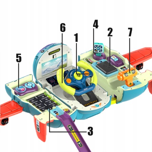 - Dodatkowo zestaw wyposażony jest w wiele przycisków, które po naciśnięciu odtwarzają różnego rodzaju dźwięki samolotu czy melodie