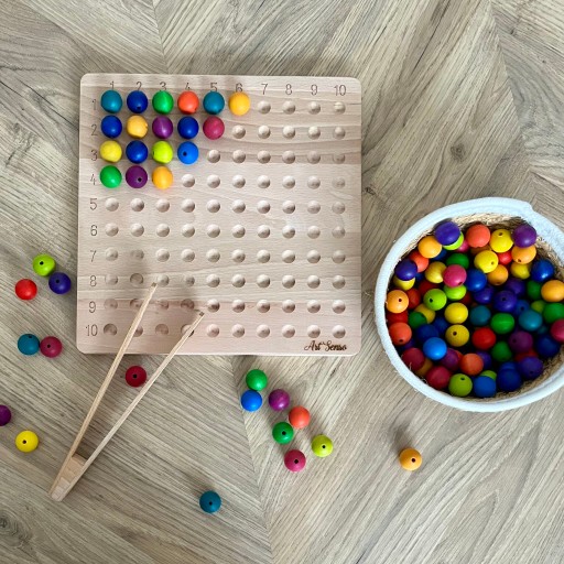 - Tablica matematyczna + kulki drewniane (100 sztuk – 2 cm) + szczypce drewniane