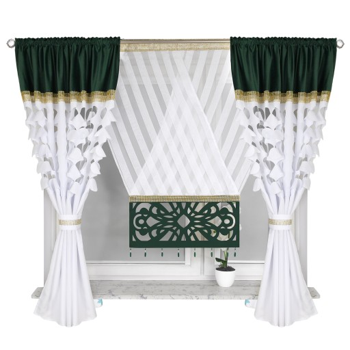 Elegancki zestaw składa się z panelu firanowego ozdobionego ażurem oraz dwóch zasłon z wewtową górą. Panel został wykonany z wysokiej jakości materiału woal w kolorze białym, natomiast zasłony z materiału panama stretch i weluru.