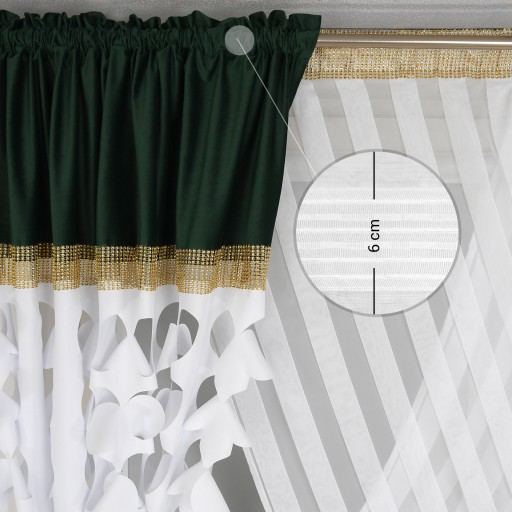 Dół panelu ażurowego udekorowany jest taśmą z koralikami. Zasłony można upiąć w kokony za pomocą tasiemek z cyrkoniami (w zestawie).