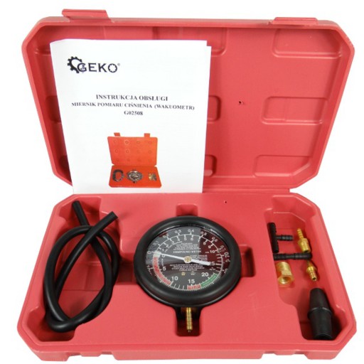Przedmiotem oferty jest miernik pomiaru ciśnienia, wakuometr marki Geko. Profesjonalny tester ciśnienia pomp paliwa. Mierzy ciśnienie i podciśnienie. Może służyć do pomiarów systemów układów hamulcowych, servo, diagnostyki zaworów, pomiarów podciśnienia w układach gaźnikowych oraz kolektorach ssących.