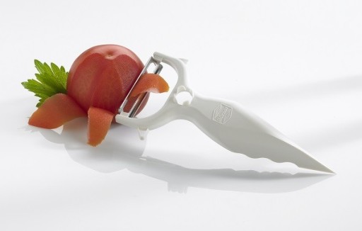 Metalowe oczko znajdujące się na boku obieraka jest niezastąpione przy wykonywaniu efektownych nacięć na m.in. rzodkiewkach, pomarańczach, tworzących tzw. kwiaty.