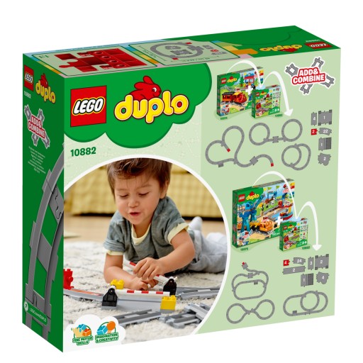 Zestaw LEGO DUPLO 10882 Tory kolejowe to nieskończone możliwości budowania ciekawych torów, które będą pasować do wszystkich nowych i istniejących zestawów z pociągami DUPLO. Przejazdy kolejowe, kozły oporowe, zwrotnice i różne proste oraz zakrzywione fragmenty torów można łączyć ze sobą na mnóstwo sposobów. Przedszkolaki mogą również ustawić czerwony klocek funkcyjny na torach. Dzięki temu wszystkie zgodne pociągi DUPLO (w tym z zestawów 10874 Ciuchcia lub 10875 Pociąg towarowy) zatrzymają się po dotarciu do niego.