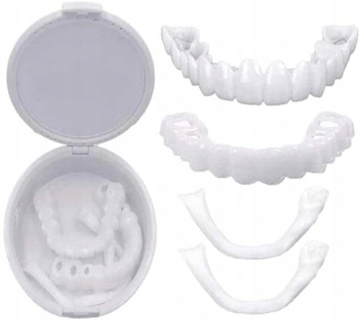 - Tymczasowa nakładka na górne i dolne żeby która pozwoli Ci w szybki i tani sposób uzupełnić braki w uzębieniu.