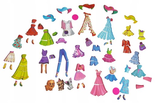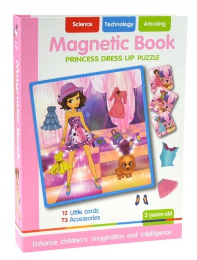 Układanka magnetyczna, która wygląda jak książka. W środku znajdziemy tablicę magnetyczna na której możemy z puzzli tworzyć różne kreacje.Na tablicy znajduje się modelka którą należy ubrać według wzoru na jednej z 12 kart lub dowolnie według własnego stylu.Magnesy są w kształtach sukienek, kapeluszy butów i torebek.Z tym zestawem Twoje dziecko będzie rozwijać kreatywność i wyobraźnię.