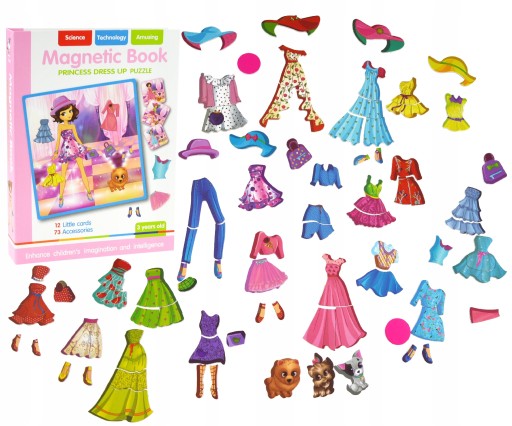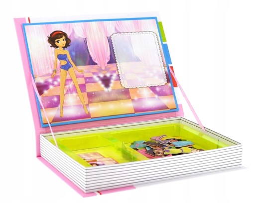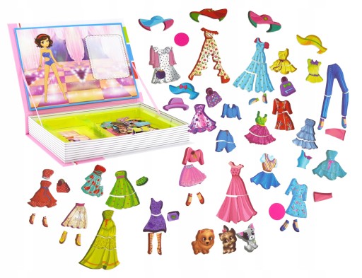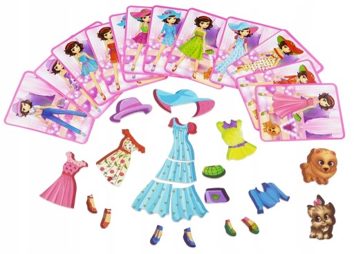Układanka magnetyczna, która wygląda jak książka. W środku znajdziemy tablicę magnetyczna na której możemy z puzzli tworzyć różne kreacje.Na tablicy znajduje się modelka którą należy ubrać według wzoru na jednej z 12 kart lub dowolnie według własnego stylu.Magnesy są w kształtach sukienek, kapeluszy butów i torebek.Z tym zestawem Twoje dziecko będzie rozwijać kreatywność i wyobraźnię.