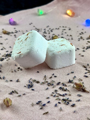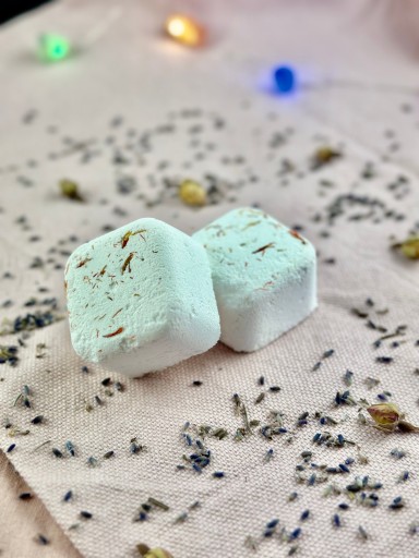Nasze kostki zawierają dodatek suszonych kwiatów Krokosza oraz olejki eteryczne, które doskonale zrelaksują, złagodzą niepokój, zmniejszą stres i drażliwość, wyciszą umysł i pomogą się zrelaksować po całym dniu.