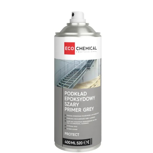 Primer Grey 400ml to gruntujący, jednoskładnikowy podkład epoksydowy w kolorze szarym służący do konserwacji i ochrony różnego rodzaju powierzchni metalowych. Dzięki obecności specjalnych żywic epoksydowych możliwe jest użycie bezpośrednio na blachę, stal ocynkowaną, aluminium, a także na stare powłoki lakiernicze.