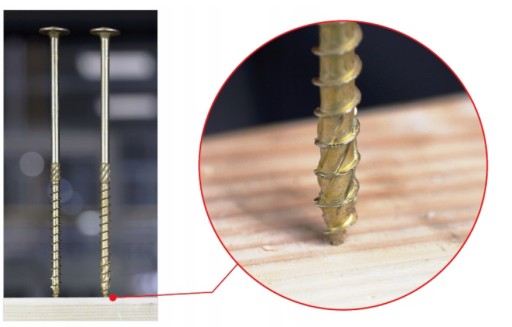 Dodatkowe usprawione zwoje na szpicu pozwalają na szybsze „chwycenie” drewna w etapie wkręcania. Jest to ważne w przypadku połączeń, gdzie dociśnięcie wkręta jest trudniejsze. Podwójny gwint powoduje, że osiągamy ten sam efekt przy dużo mniejszej sile docisku.