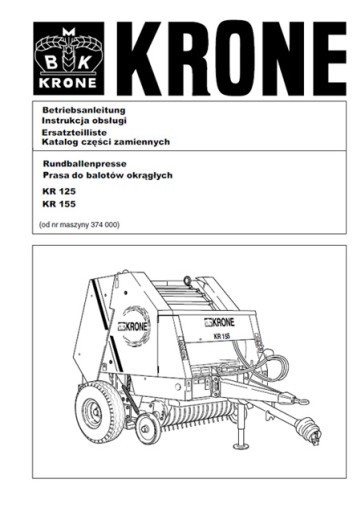 Instrukcja obsługi, katalog części pras do balotów okrągłych Krone KR 125, KR 155 (od nr maszyny 374000 do 384499)