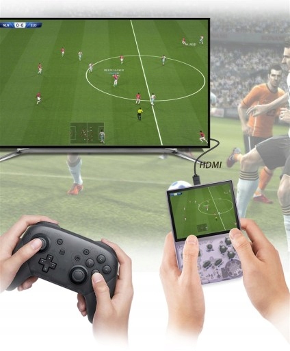 Konsola również pozwala na podłączenie do telewizora (HDMI), a także obsługuje dodatkowego pada przewodowego lub bezprzewodowego (2.4G), co pozwala na grę w dwie osoby.