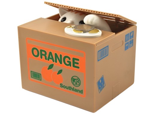 - Otworzy się wieko pudełka, kotek zabierze łapką monetę z talerzyka do środka pudełka.