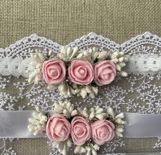 Bezuciskowa opaska z różyczkami i pasek wykonany z satynowej wstążki i różyczek to ręcznie robiony komplet, który ożywi stylizację Twojej Córeczki w wyjątkowym dniu chrztu, ślubu czy innej uroczystości rodzinnej. Baza opaski to biała gumo-koronka, na której umieściłyśmy aplikację kwiatową. Pasek do sukienki wykonany jest ze wstążki satynowej o długości 130 cm w kolorze białym. Kompozycja na pasku ma wymiary około 9 cm x 4 cm.