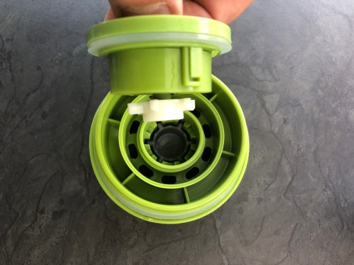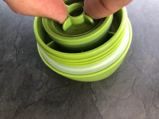 Otwierany i zamykany na przycisk - po zamknięciu kubek jest szczelny, nawet po przewróceniu.