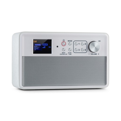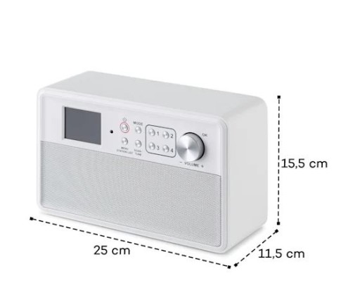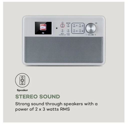 Stylowe urządzenie o mocy 2 x 3 W RMS posiada tunery radiowe DAB+ i FM, które zapełniają zarówno odbiór cyfrowy, jak i analogowy wszystkich stacji w bliższej okolicy. Dzięki RDS wyświetlane są poza tym użyteczne informacje dodatkowe o danej stacji radiowej, tytuły utworów lub albumów. Urządzeniem steruje się za pomocą kolorowego wyświetlacza TFT o przekątnej 2,4 cala z bardzo dużymi cyframi i literami, płynnie działających przycisków na urządzeniu, a także przy użyciu pilota zdalnego sterowania. Oprócz powiększonego wyświetlacza dla seniorów i dzieci przydatne są również dwa tryby pracy do wyboru: w trybie podstawowym aktywowana jest częściowa blokada przycisków, aby uniknąć błędnej obsługi i zmiany ustawień. aktywne są tylko przycisk wł./wył., ustawienie głośności i przyciski 4 miejsc w pamięci, podczas gdy w trybie standardowym dostępne są wszystkie funkcje, takie jak wyszukiwanie stacji, listy stacji i ustawienia. Wejście słuchawkowe umożliwia również słuchanie muzyki w każdej chwili późnym wieczorem. Dzięki eleganckiemu i prostemu wzornictwu to poręczne radio pasuje również doskonale do każdego wystroju mieszkania.