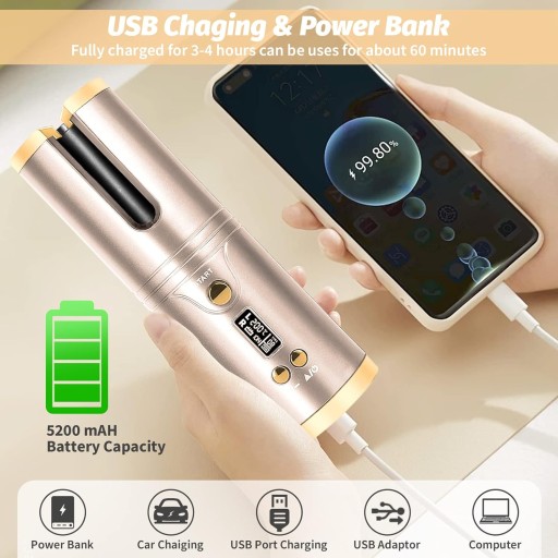 - 【Przenośny ładowany przez USB】 Cyfrowy wyświetlacz LCD może wyświetlać: ciepło, timer, kierunek zwijania. Lokówki mają wbudowaną baterię litową 5200 mAh, która może wytrzymać 40-60 minut po pełnym naładowaniu 3-4 godzin, z funkcją automatycznego wyłączania, oszczędzającą energię i zapewniającym bezpieczeństwo aplikacji, może być również używana jako mobilny zasilacz.