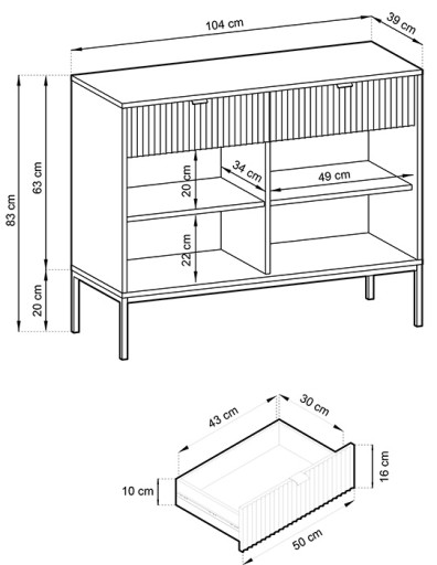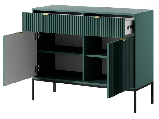 Złoty uchwyt na krawędzi pięknych ryflowanych frontów, występujących w wersjach: szarym, czarnym i białym – adekwatnie z kolorami korpusu. Wszystko uniesione na delikatnej podstawie dostępnej w dwóch wersjach kolorystycznych, czarnej oraz złotej.