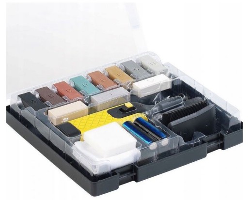 zawartość: 1 nagrzewnica, 11 wosków kolorowych, 1 gąbka do szlifowania, 1 szmatka do czyszczenia, 1 szpachelka z funkcją strugania, 1 szpachelka z zaokrągleniem, 1 skrobak do czyszczenia,
