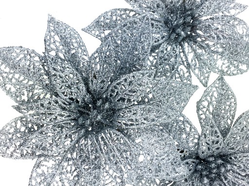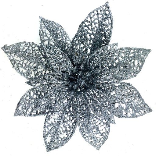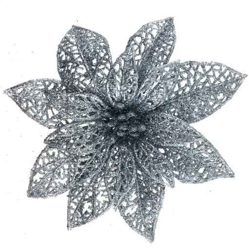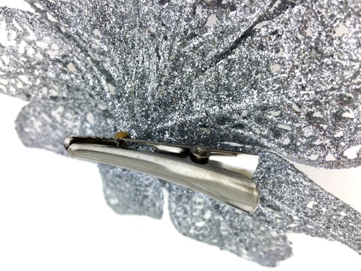 POINSECJA SREBRNA - ażurowy kwiat rozkwitniętej gwiazdy betlejemskiej wykonany z tworzywa w formie ozdoby choinkowej. Kwiat srebrny na klipsie, dekorowany bardzo drobnym, mieniącym brokatem Całość w srebrnym, błyszczącym kolorze - pięknie mieni się w świetle.