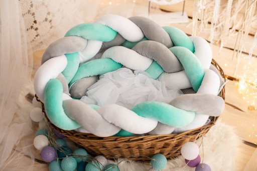 11. Końce warkocza połączone są ozdobnymi troczkami. Takie rozwiązanie pozwala na rozplecenie warkocza co szczególnie istotne jest podczas prania, do dokładnego wypłukania środków piorących. Dzięki takiemu rozwiązaniu można przepleść warkocz przez szczebelki łóżeczka.