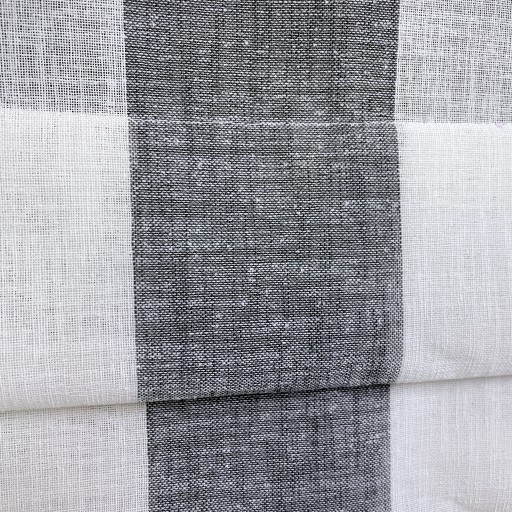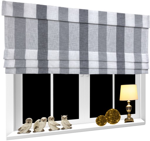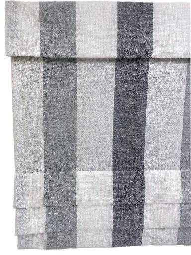 Roletka wykonana z tkaniny w kolorze białym z szarymi paskami. U góry wszyta taśma 5 cm. Można przypinać żabkami lub wsuwać na tunel.